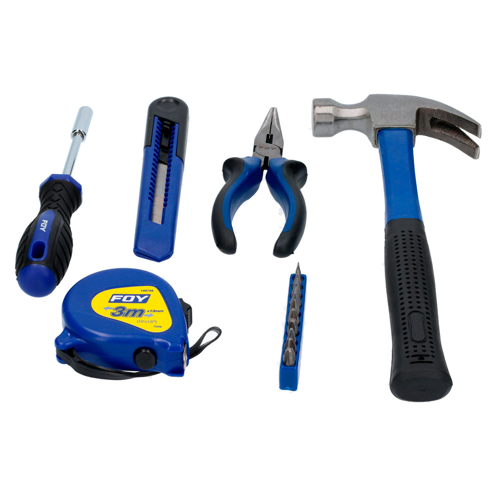 -Herramientas básicas para todo tiempo de reparaciones. Contenido: Martillo mango fibra de vidrio 8oz. Pinza punta larga 6". Destornillador magnético para puntas. 10 puntas: planas: SL3, SL4, SL5, SL6. Phillips: PH1, PH2, PH3. Pozdriv: PZ1, PZ2, PZ3. Flexómetro de 3 m. Cúter de 18mm. Estuche.