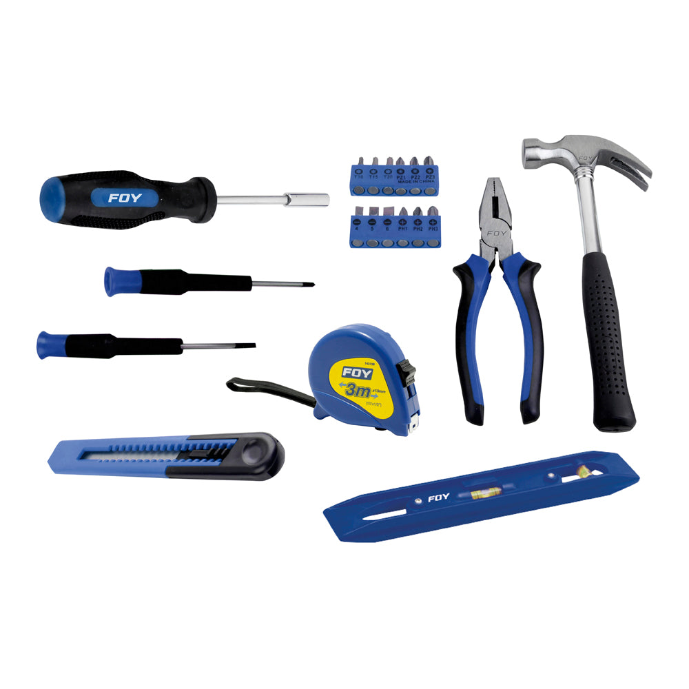 -Herramientas básicas para todo tiempo de reparaciones. Contenido: Martillo de uña mango tubular 8oz. Pinza para mecánico 6". Destornillador magnético para puntas. 2 destornilladores de precisión. 12 puntas: planas: SL4, SL5, SL6. Phillips: PH1, PH2, PH3. Pozdriv: PZ1, PZ2, PZ3. Torx: T10, T15,T20. Flexómetro 3m. Cúter 18mm. Nivel 6". Blíster.